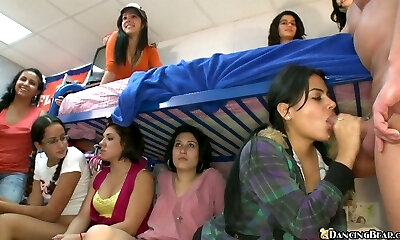 College doll is sucking a cock in front of her friends until the guy cums filling her mouth with jizz